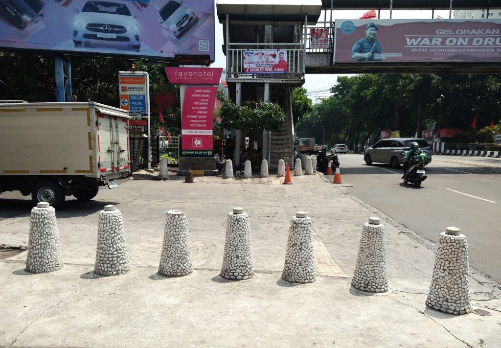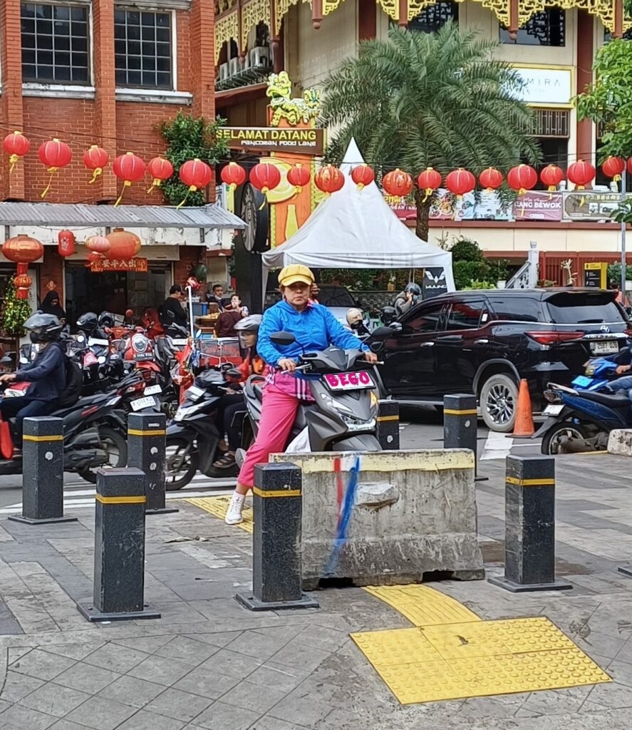 My friend photographed this dumbass in March 2026. The pedestrian walkway is in Pancoran – a working-class, largely ethnic-Chinese neighborhood in Central Jakarta. The city left some space between bollards to improve wheelchair access. Yet because of idiots like this, they plonked a concrete barrier into the gap.