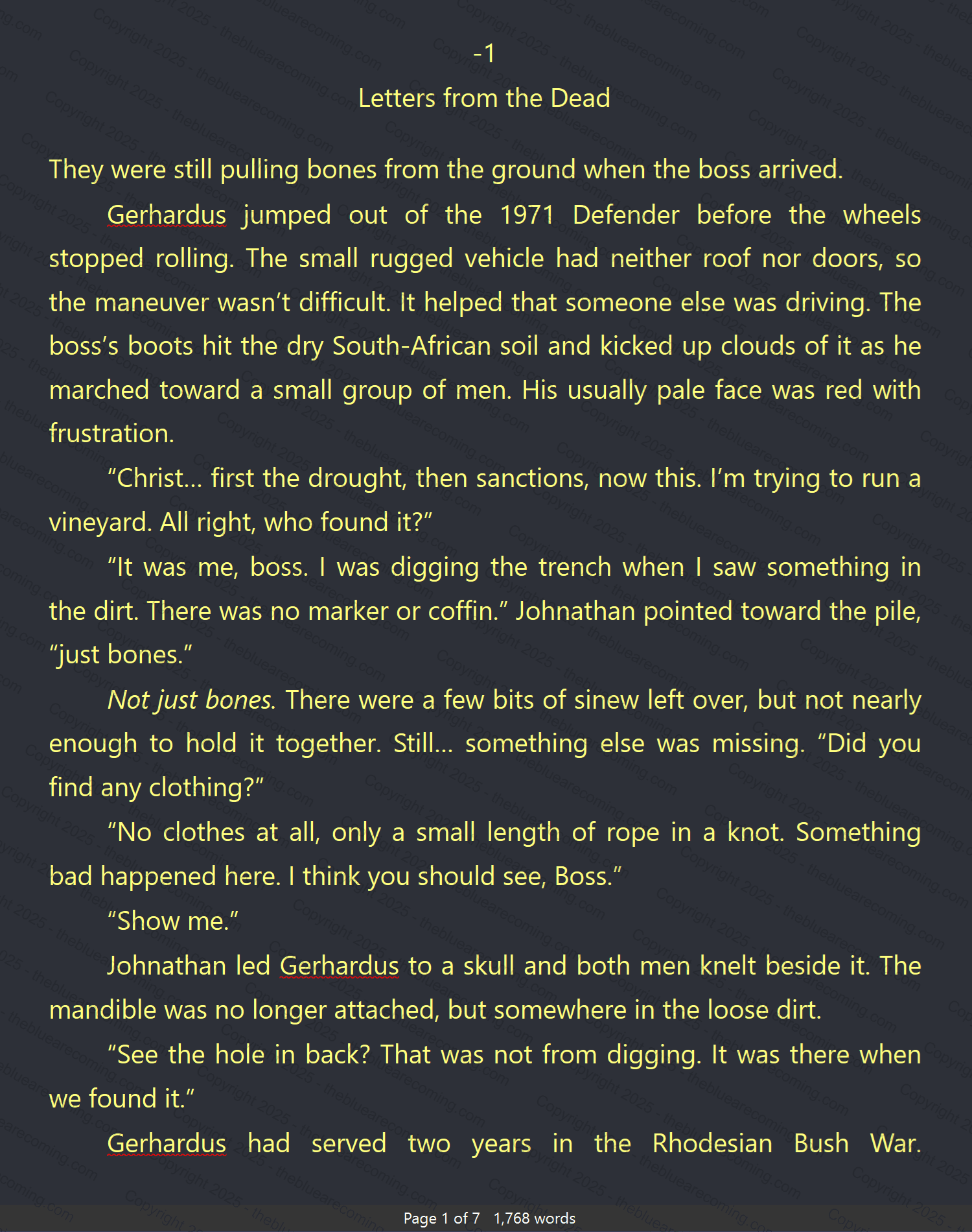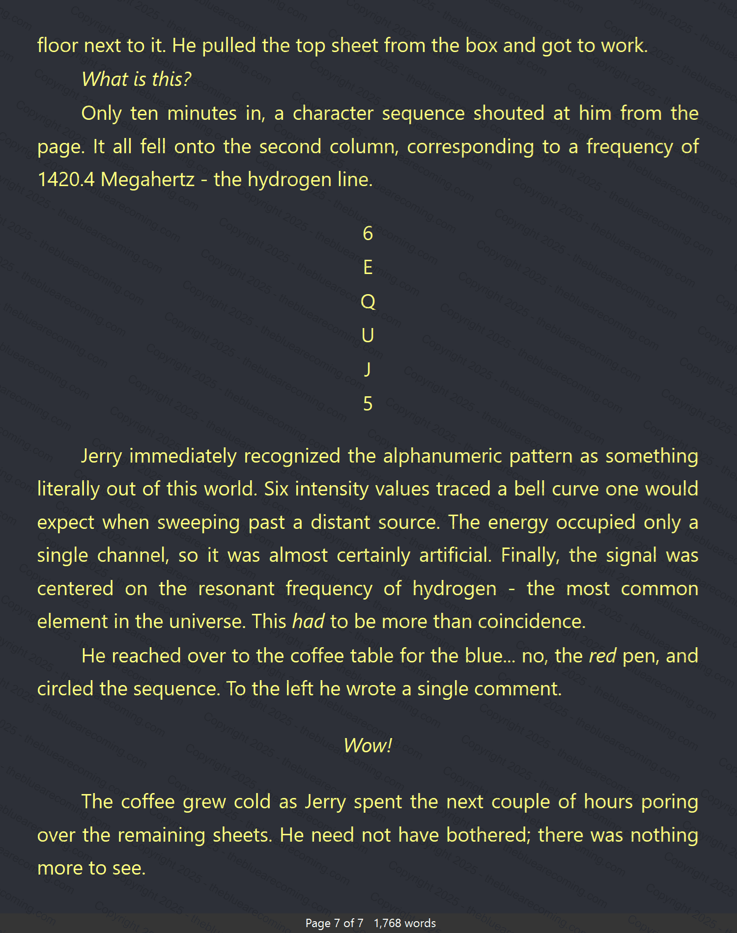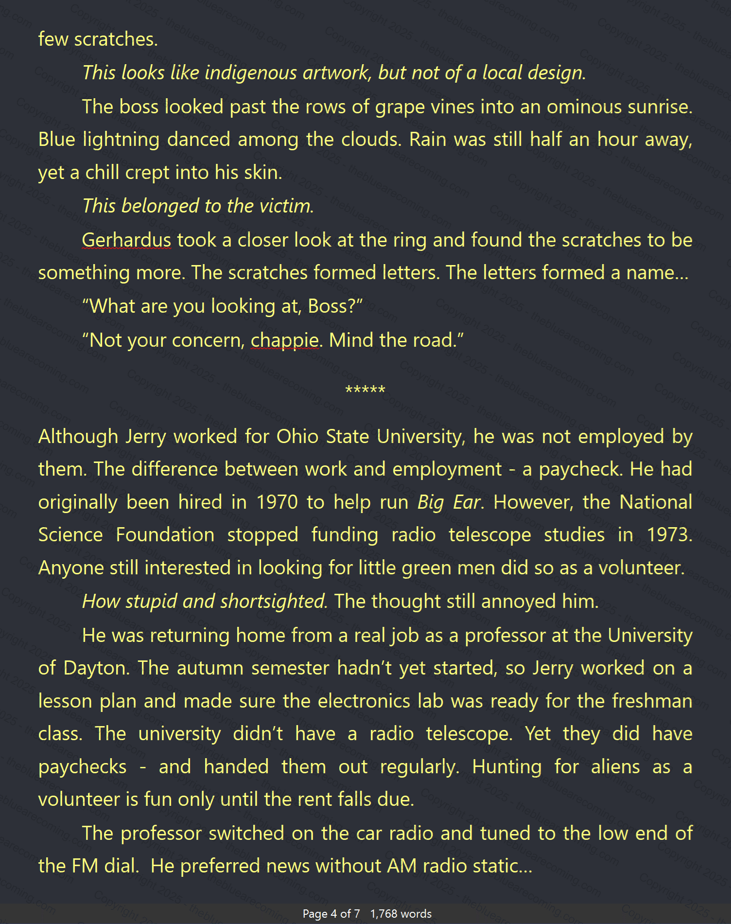 My chapters are getting longer. “Letters from the Dead” is 1768 words (about seven paperback pages), not including the title. It’s another two-scene chapter. Each has something to do with “letters”, yet not in a way you might think. We start with the discovery of bones in South Africa and end with a caffeinated radiotelescope volunteer in Ohio, United States. There’s a connection to previous chapters and to what comes next. Why not stick around to see how it all fits together 🙂