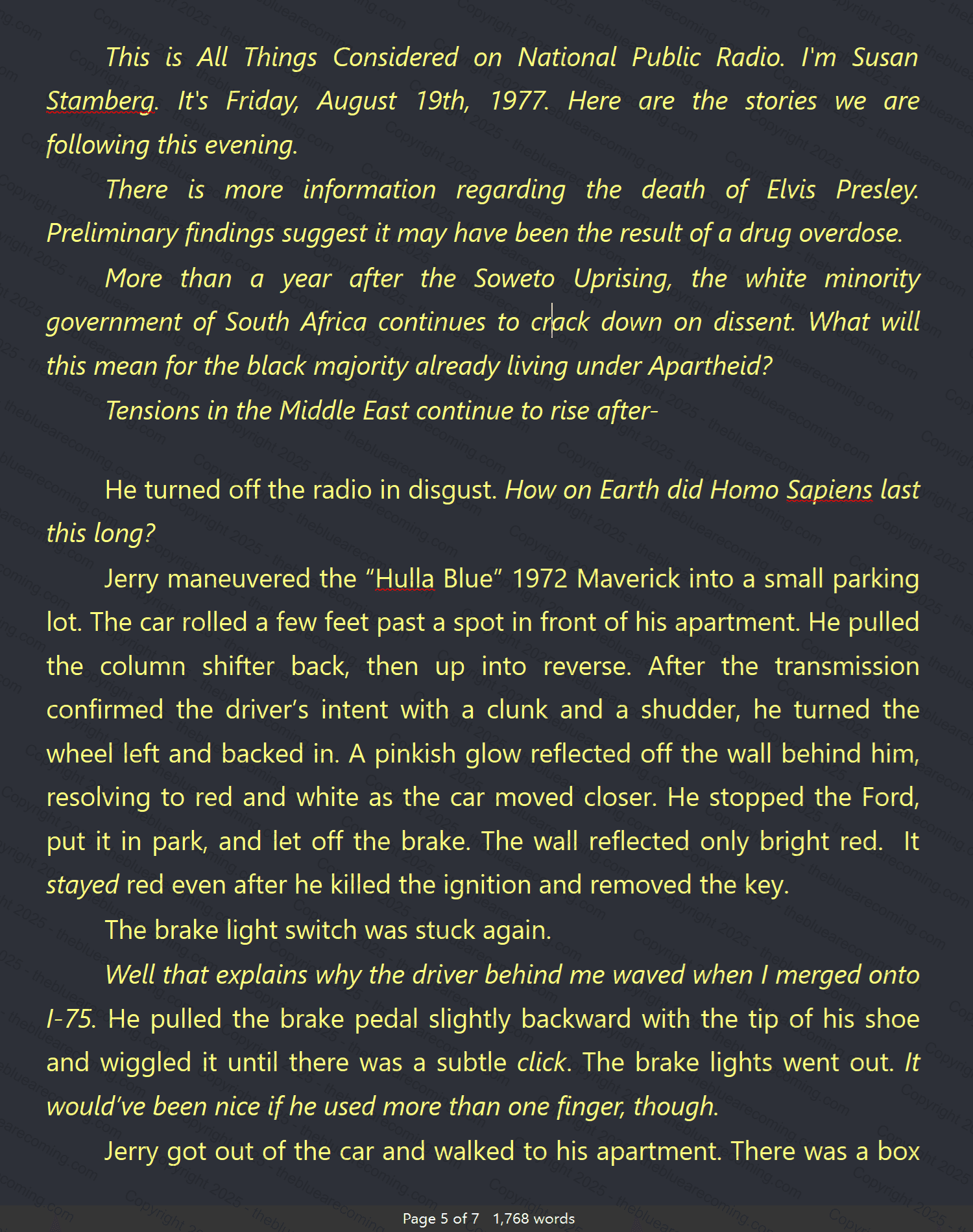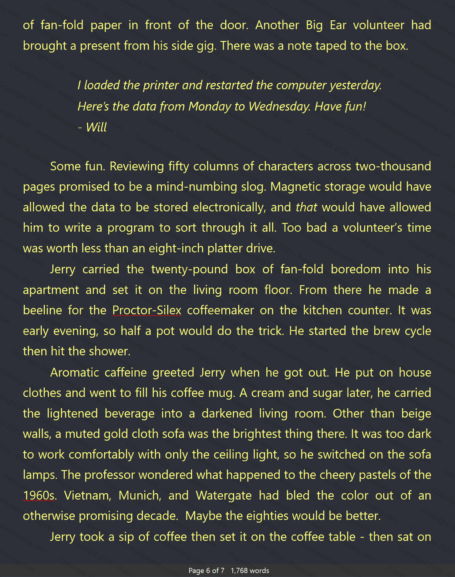 Ah… too much detail with the Jerry scene. I read a lot of Neal Stephenson, can you tell? You should’ve seen the previous iteration when it was twice as long 😀 Maybe I’ll cut cack on the scenery. I think I’m trying too hard to inject a 70s vibe.