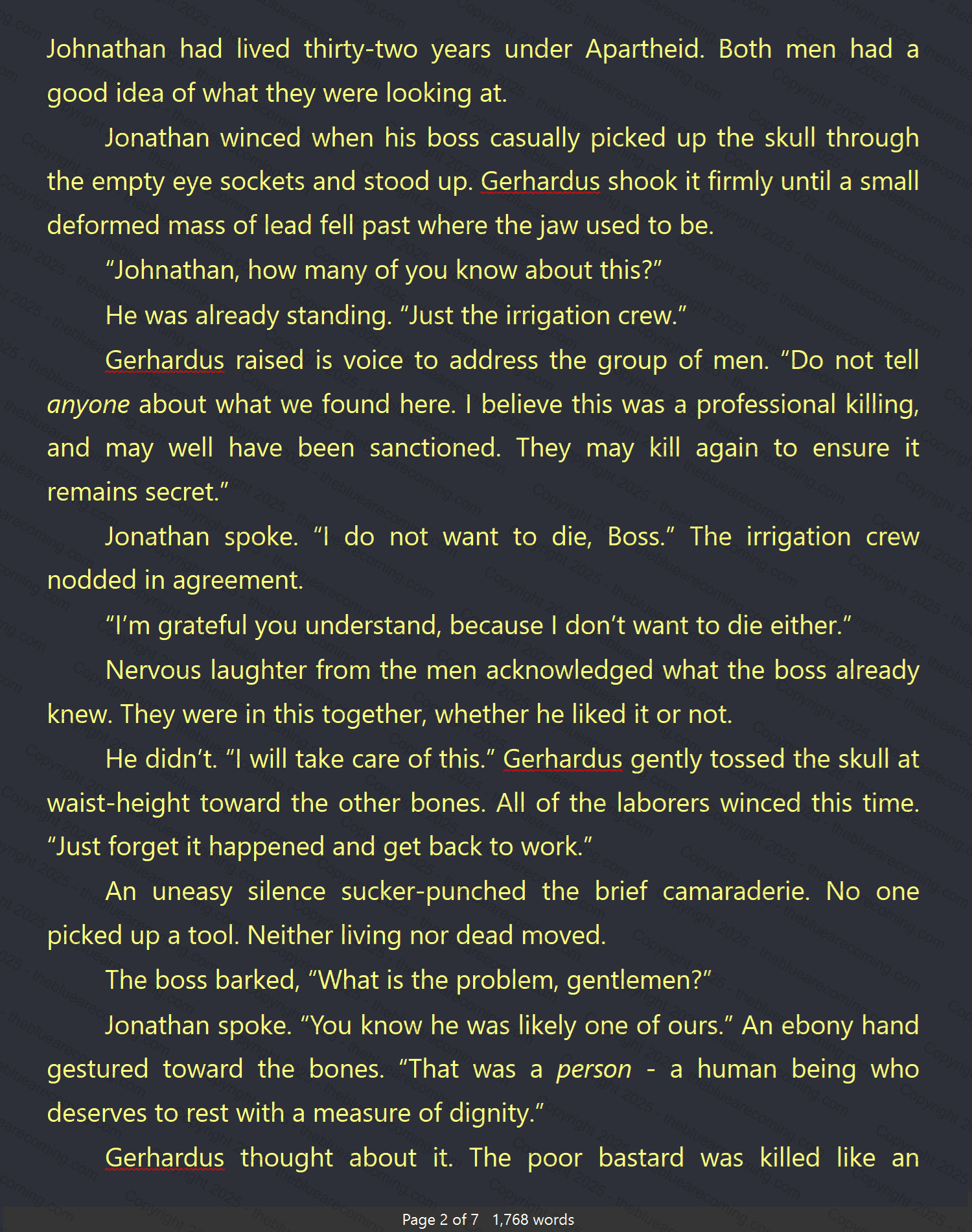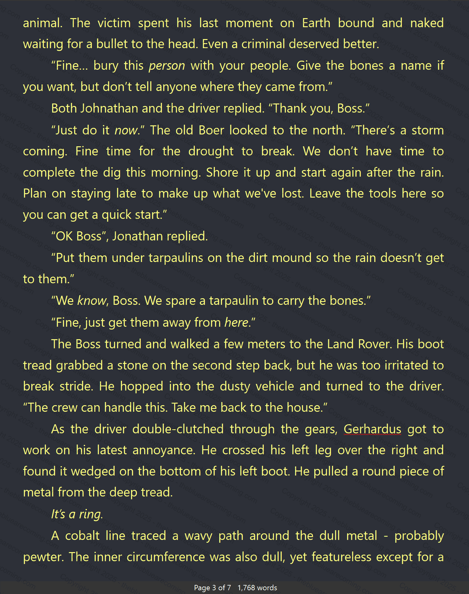 Oh yeah… I reformatted the pages again. The font is a skosh larger than before (I wound up going with 16pt). There’s a chapter wordcount and page numbers in the screen grabs so you don’t get lost – and so I don’t skip a page and post another one twice like I did last time.